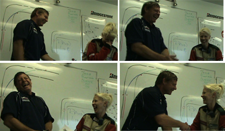 I was still beside myself at this point, from my big day, so he took over the interview and even led us to espouse the merits of Bridgestone tires, to which I exclaimed, “Yup! They’re the only reason I was able to stay on the road!”… “too far Keri, too far”.