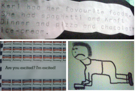 – you know when you’re in like grade 1 and older kids do projects with you? These older kids had to write a book about us younger ones, and the top photo was the page about my favourite foods; I haven’t changed much
