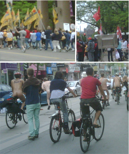 In over 40 cities around the globe people rode their bikes naked to raise awareness of bike safety issues and environmental ones, too.  The Toronto ride was organized by TNT!Men, the same group that lobbied and won for Hanlan’s Point Beach on Toronto Island to be ‘clothing optional’; it’s one of just two in Canada (the other is in Vancouver).