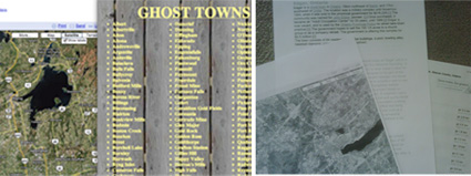 On the left is what my screen looks like when I sit down and start – a basic Google map of the area, and then I start pulling up bookmarked sites, like GhostTowns.com, and on the right is what it looks like when I’m done, a small handful of printouts.